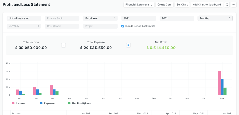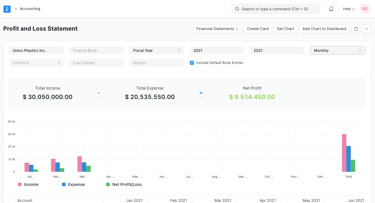 The Profit and Loss (P&L) Statement summarizes all revenues and expenses for a given period. In ERPNext, you can run the report across multiple years or periods for comparison, filter by Finance Book, Project, or Cost Center, and display balances in any currency. For quarterly or monthly reports, you can choose to show either accumulated balances or balances for each period individually.
