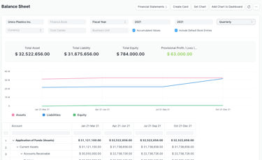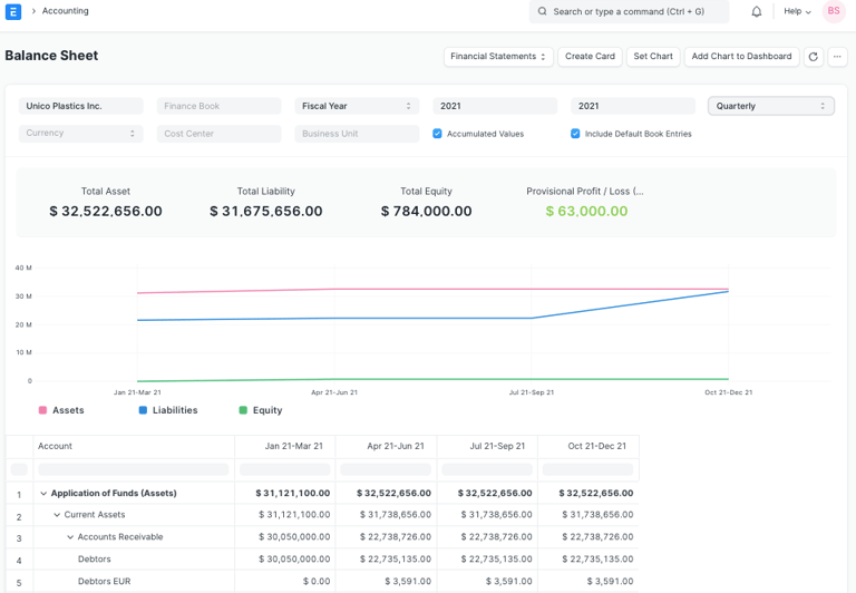 A Balance Sheet is the financial statement of a company which states assets, liabilities and equity at a particular point in time. The Balance Sheet in ERPNext gives you more flexibility to analyse your financial position. You can run the report across multiple year to compare values. You can check values for a specific Finance Book or Cost Center. You can also choose any other currency to display the balances.