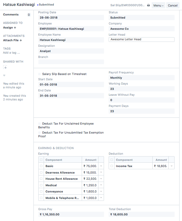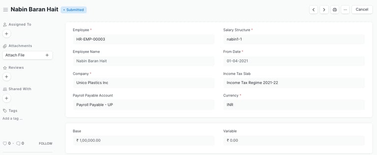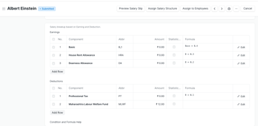 let you assign a salary structure to each employee and define their base pay. The base salary is essential, as it serves as the foundation for all payroll calculations according to the assigned salary structure.