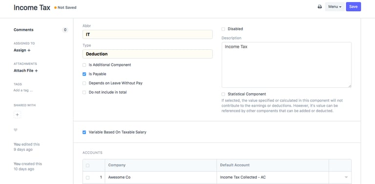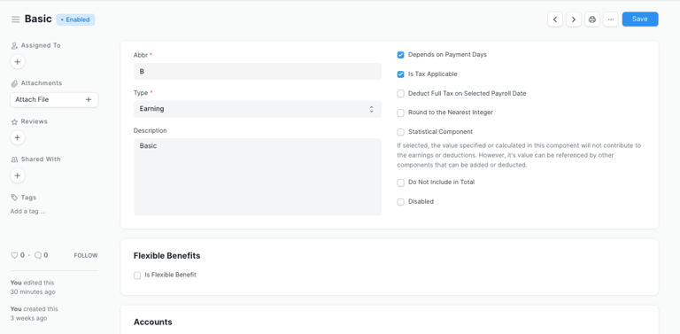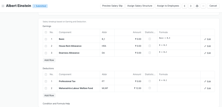 This document allows you to create and manage earning and deduction components for Salary Structures, Salary Slips, and Additional Salary entries. You can customize formulas, conditions, and settings based on your company’s payroll policies.
