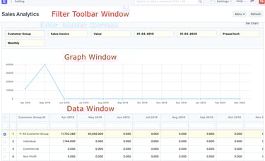 Monitor your company’s sales performance and analyze data from multiple perspectives. Use filters to dynamically adjust the information displayed. The Sales Analytics Report consists of three main areas: the Filter Toolbar, the Graph Window, and the Data Window, providing a comprehensive view of your sales performance.
