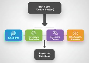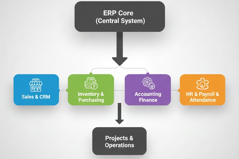 An ERP (Enterprise Resource Planning) system is a type of business management software that helps organizations automate, integrate, and manage their core processes in a centralized system. These processes include finance, inventory, sales, human resources, procurement, manufacturing, and more.